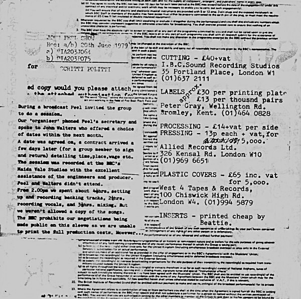 The Peel Sessions EP (above) actually has the contract they signed with the BBC as the ground on which the demystification info is printed. And for utter transparency there is also a written account, on the left, of how the process went down with the Peel show (within the limits imposed by the BBC, which didn't allow them to discuss the negotiations). This is juxtaposed (on the right) with the ir own production costs for the vinyl EP.
